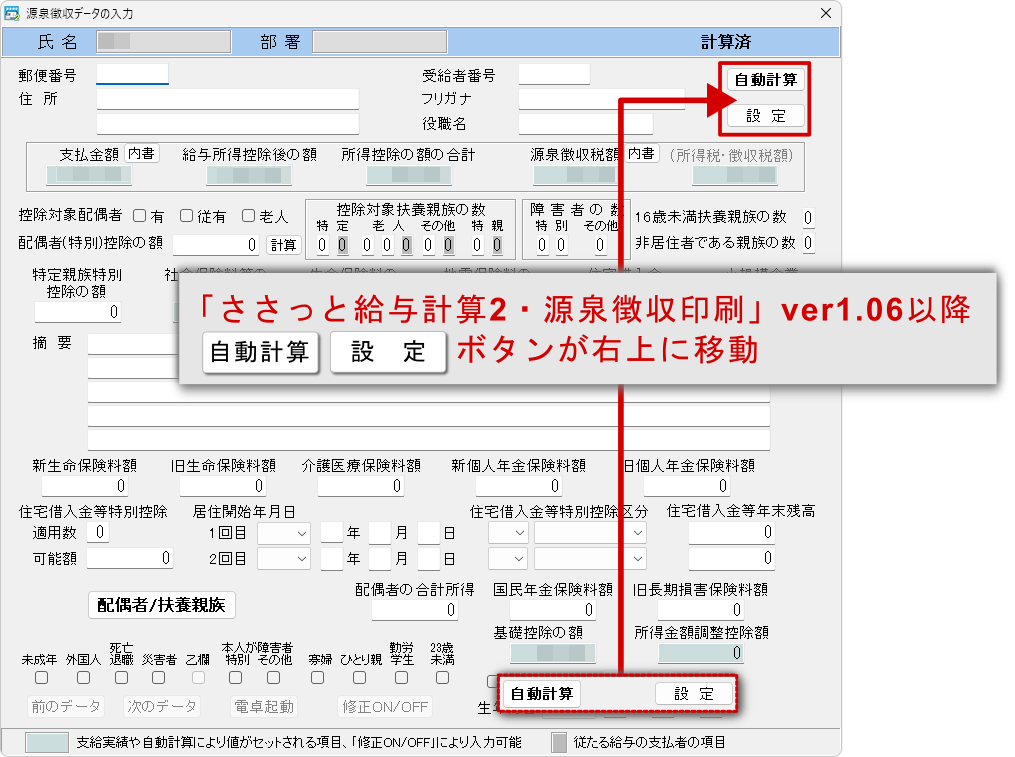 よくあるご質問TOPささっと給与計算2 Q&A源泉徴収印刷 操作・製品仕様源泉徴収票の会社住所について入力方法を教えて ささっと給与計算2 Q&A Ver1.06よりデータ入力画面の「自動計算」「設定」ボタンが右上に移動しました。