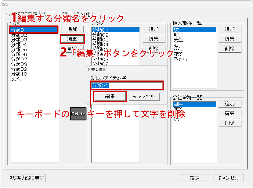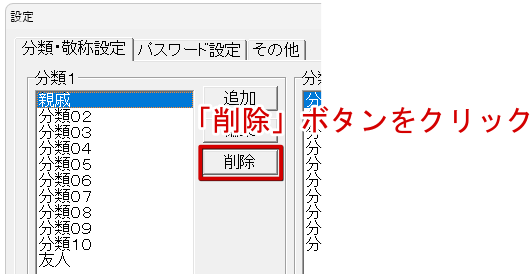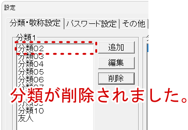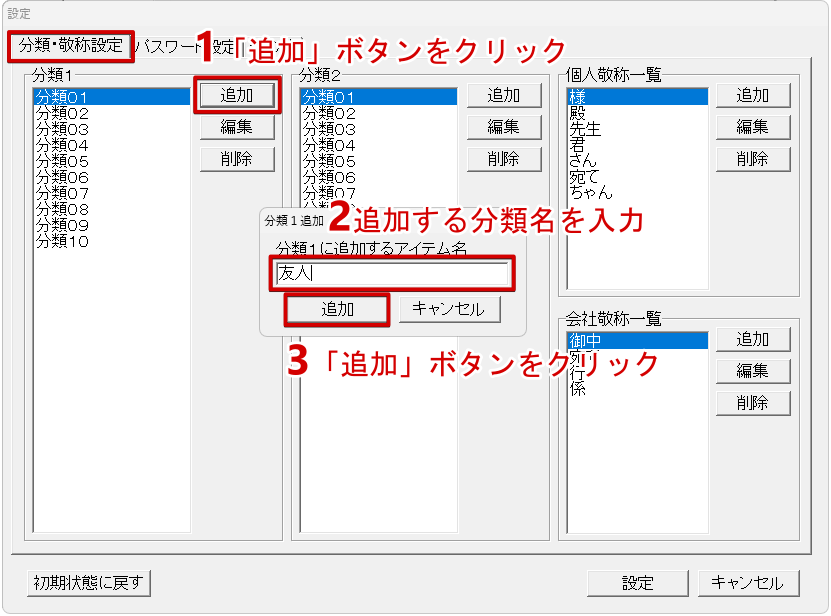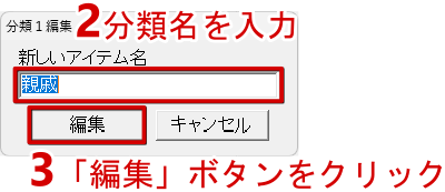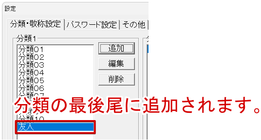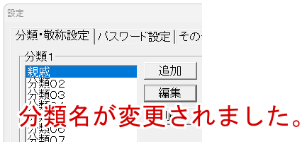 分類名の設定 例:友人、親戚、会社関係、個人用、会社用など