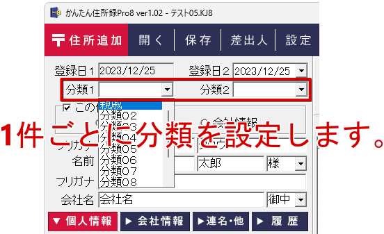 住所録一覧 画面で宛先1件ごとに分類を設定します。